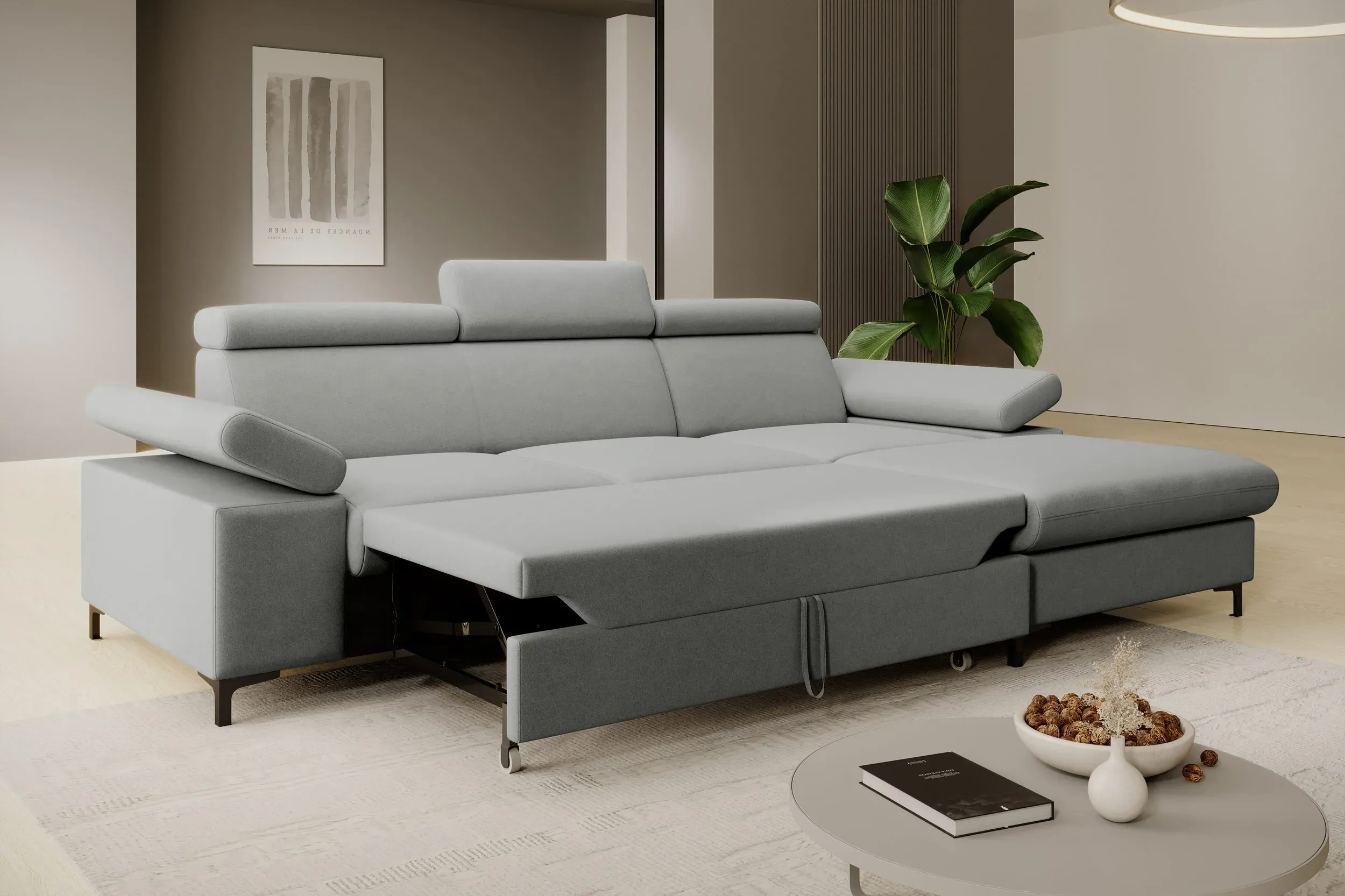 Equipped with a sleeping function and a storage compartment for bedding. Whether hosting guests or planning a night in front of the TV, you can quickly transform the seating area into a full-sized bed. The fabric used for the sleeping surface matches the rest of the sofa, creating a cohesive and aesthetic look.
